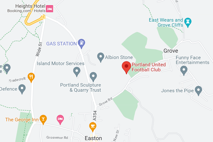 On entering the Island of Portland, stay on the main road (signposted for Easton) to the top of the Island (unmistakable – sharp steep hairpin bend with the Portland Heights Hotel in front of you). Continue towards Easton into Yeats Road and Easton Lane. 100 yards after passing the Drill Hall (Castle like building) turn left into Grove Road. Portland United Football Club is located 200-300 yards on the left.
